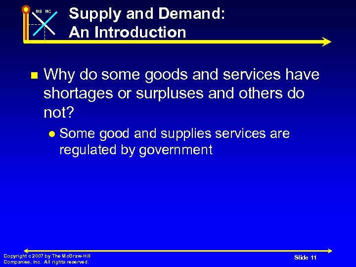 MB MC n Supply and Demand: An Introduction Why do some goods and services have shortages or surpluses and others do not? l Some good and supplies services are regulated by government Copyright c 2007 by The Mc. Graw-Hill Companies, Inc. All rights reserved. Slide 11