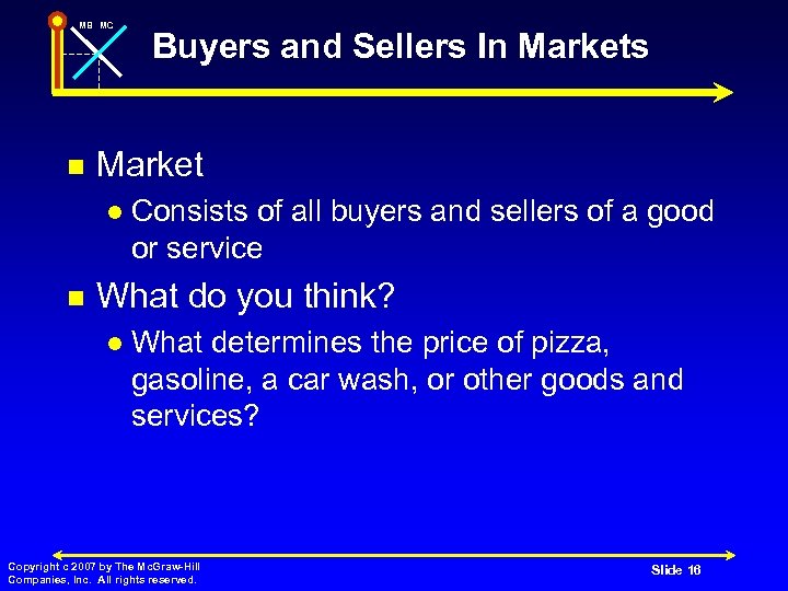 MB MC n Market l n Buyers and Sellers In Markets Consists of all buyers and sellers of a good or service What do you think? l What determines the price of pizza, gasoline, a car wash, or other goods and services? Copyright c 2007 by The Mc. Graw-Hill Companies, Inc. All rights reserved. Slide 16