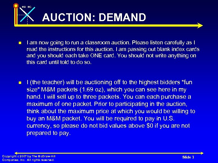 MB MC AN INTRO TO SUPPLY AND DEMAND- SEPT. 23 ENGLISH AUCTION: HOW TO APPLY ECONOMICS I will be selling an announced number of M&M packets through an English auction to derive a classroom demand curve. In the same lecture I will give each student a packet of M&Ms and buys back an announced number of packets through a reverse English auction to derive a classroom supply curve. Copyright c 2007 by The Mc. Graw-Hill Companies, Inc. All rights reserved. Slide 2