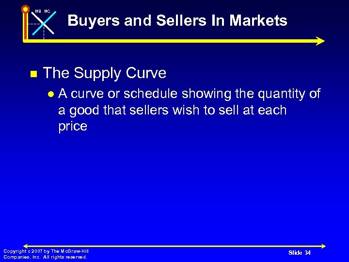 MB MC n Buyers and Sellers In Markets The Supply Curve l A curve or schedule showing the quantity of a good that sellers wish to sell at each price Copyright c 2007 by The Mc. Graw-Hill Companies, Inc. All rights reserved. Slide 34