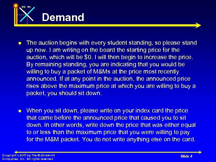 MB MC AUCTION: DEMAND n I am now going to run a classroom auction. Please listen carefully as I read the instructions for this auction. I am passing out blank index cards and you should each take ONE card. You should not write anything on this card until told to do so. n I (the teacher) will be auctioning off to the highest bidders "fun size" M&M packets (1. 69 oz), which you can see here in my hand. I will sell up to three packets. You can each purchase a maximum of one packet. Prior to participating in the auction, think about the maximum price at which you would be willing to buy an M&M packet. You will be required to pay in U. S. currency, so please do not bid values above $0 if you are not prepared to pay. Copyright c 2007 by The Mc. Graw-Hill Companies, Inc. All rights reserved. Slide 3