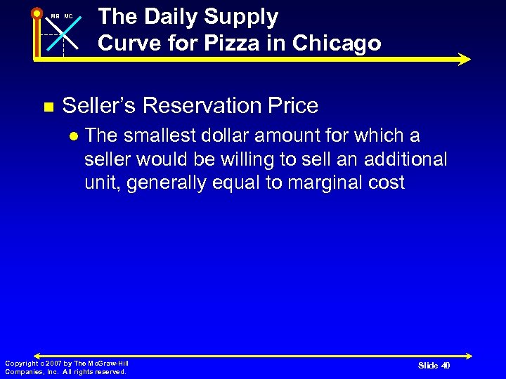MB MC n The Daily Supply Curve for Pizza in Chicago Seller’s Reservation Price l The smallest dollar amount for which a seller would be willing to sell an additional unit, generally equal to marginal cost Copyright c 2007 by The Mc. Graw-Hill Companies, Inc. All rights reserved. Slide 40