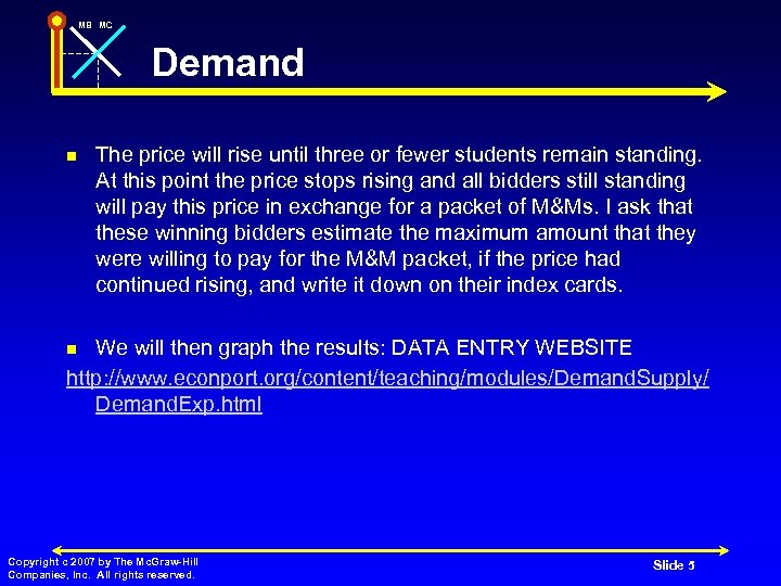 MB MC Demand n The auction begins with every student standing, so please stand up now. I am writing on the board the starting price for the auction, which will be $0. I will then begin to increase the price. By remaining standing, you are indicating that you would be willing to buy a packet of M&Ms at the price most recently announced. If at any point in the auction, the announced price rises above the maximum price at which you are willing to buy a packet, you should sit down. n When you sit down, please write on your index card the price that came before the announced price that caused you to sit down. In other words, write down the price that was either equal to or less than the maximum price that you were willing to pay for the M&M packet. You do not write anything else on the card. Copyright c 2007 by The Mc. Graw-Hill Companies, Inc. All rights reserved. Slide 4