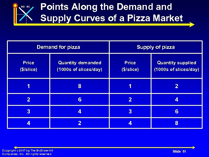 MB MC Excess Demand Price ($ per slice) Supply 4 Excess demand = 8, 000 slices per day 3 2 Demand 8 Copyright c 2007 by The Mc. Graw-Hill Companies, Inc. All rights reserved. 16 Quantity (1000 s of slices per day) Slide 50