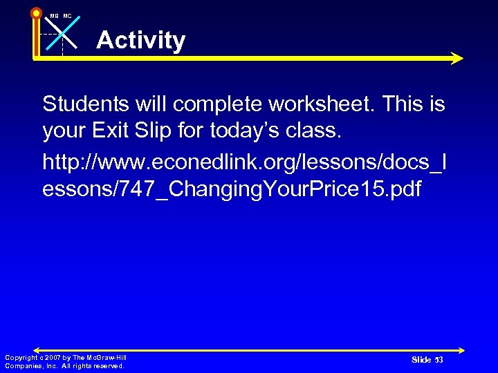 MB MC Activity Students will complete worksheet. This is your Exit Slip for today’s class. http: //www. econedlink. org/lessons/docs_l essons/747_Changing. Your. Price 15. pdf Copyright c 2007 by The Mc. Graw-Hill Companies, Inc. All rights reserved. Slide 53