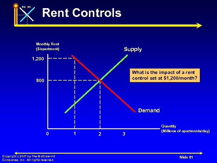 MB MC Rent Controls Monthly Rent ($/apartment) Supply 1, 200 What is the impact of a rent control set at $1, 200/month? 800 Demand 0 Copyright c 2007 by The Mc. Graw-Hill Companies, Inc. All rights reserved. 1 2 3 Quantity (Millions of apartments/day) Slide 61