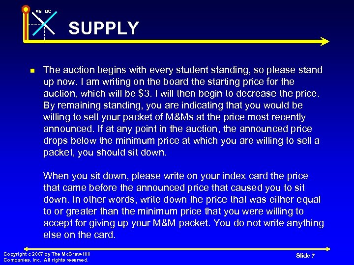 MB MC AUCTION: SUPPLY n I am now going to run another classroom auction that is similar to the previous one we ran with the exception that instead of selling M&M packets through the auction, I will be buying M&M packets. Please listen carefully as I read the instructions for this auction. I am passing out blank index cards and you should each take ONE card. You should not write anything on this card until told to do so. I am also passing around "fun size" M&M packets (1. 69 oz). You should each take just ONE packet. Please do not take any more than one packet. n I (the teacher) will be purchasing up to three M&M packets from students in the classroom. You can sell a maximum of one packet each. Prior to participating in the auction, think about the minimum price at which you would be willing to sell your M&M packet to me Copyright c 2007 by The Mc. Graw-Hill Companies, Inc. All rights reserved. Slide 6