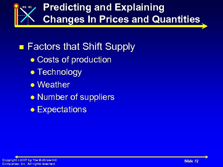 MB MC n Predicting and Explaining Changes In Prices and Quantities Factors that Shift Supply Costs of production l Technology l Weather l Number of suppliers l Expectations l Copyright c 2007 by The Mc. Graw-Hill Companies, Inc. All rights reserved. Slide 72