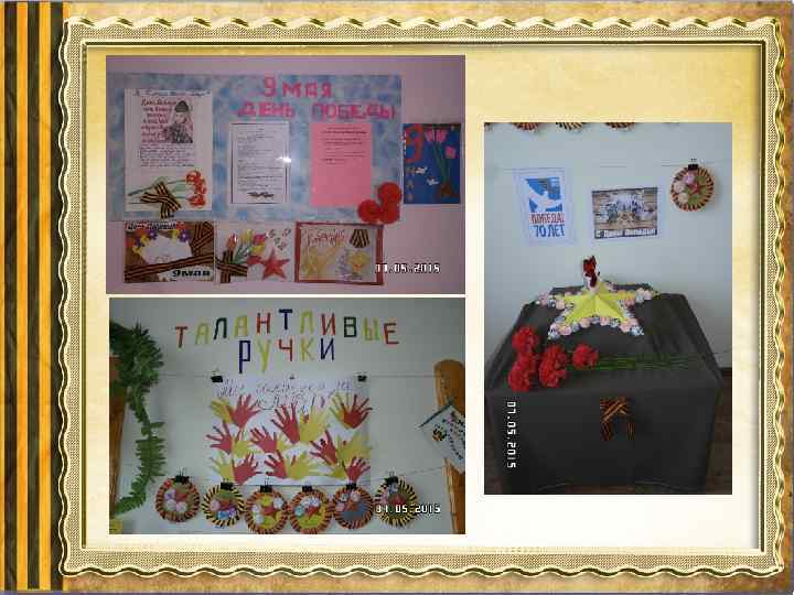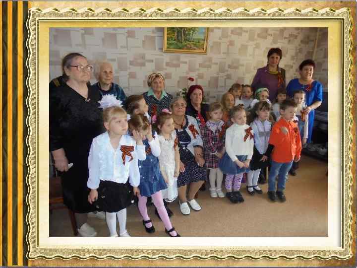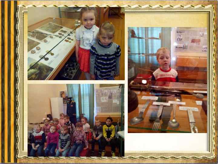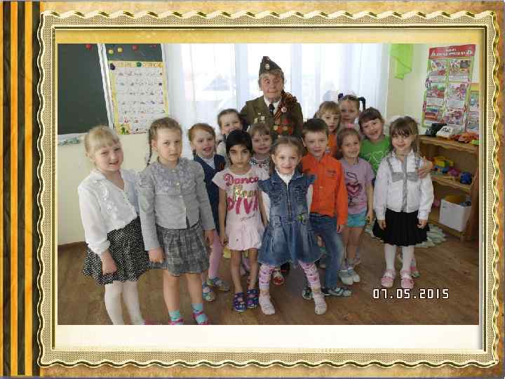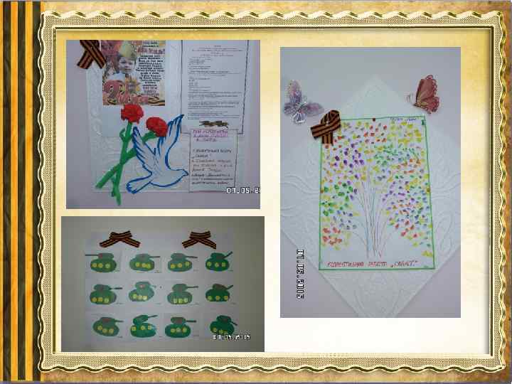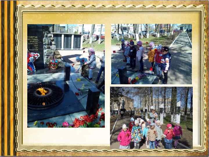 Основной этап: • систематизированная игровая деятельность; • цикл занятий по познавательному, речевому развитию, знакомство с художественной литературой и ознакомление с орденом Александра Невского). • разучивание песен о войне с музыкальным руководителем; • оформление уголков к 70 -летию победы; • оформление выставки детских рисунков; • изготовление подарков для ветеранов; (конспект) • проведение спортивного праздника «Защитники Родины» • экскурсия к памятным местам города. • экскурсия в музей; • поздравление ветеранов; • возложение цветов к Вечному огню. • привлечение детей к акции «Бессмертный полк» .