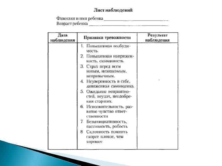 Рекомендации по работе с тревожными детьми Данные социометрии и приемы работы с тревожными детьми группы; Анализ взаимоотношений ребенок – воспитатель и приемы налаживания этих отношений; Приемы общения и перечень коррекционных игр для тревожных детей в группе; Приемы помощи детям с нарушениями игровой деятельности; Анализ уровня возрастного развития детей группы, перечень игр и упражнений по развитию памяти, внимания, мышления, восприятия, воображения у детей.