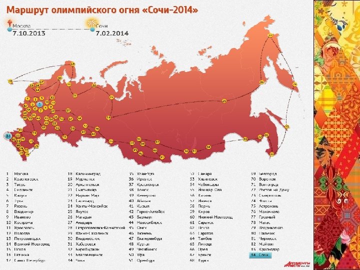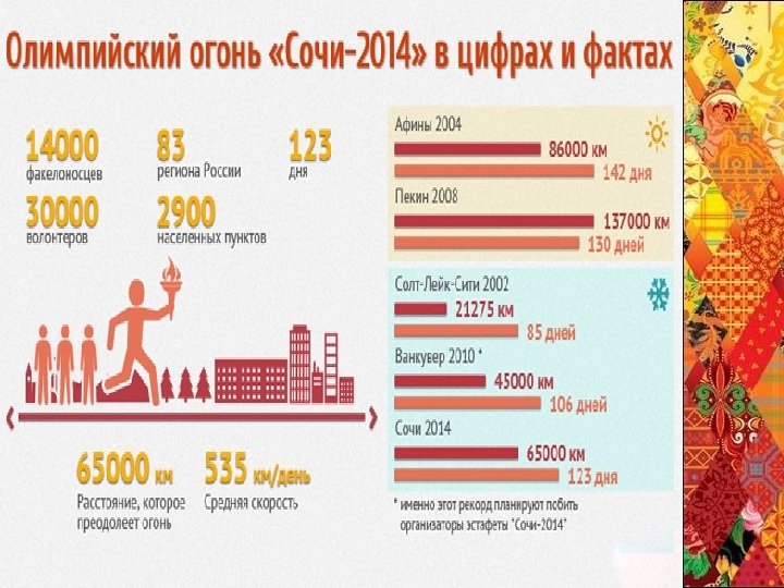 Эстафета олимпийского огня «Сочи 2014» является самой продолжительной и масштабной в истории зимних Олимпийских игр Эстафета с участием 14 тысяч факелоносцев началась 7 октября 2013 года и завершилась в день открытия Олимпиады 7 февраля 2014 года Маршрут олимпийского огня по регионам России был представлен оргкомитетом «Сочи 2014» ровно за год до старта эстафеты. В течение 123 дней факел Игр в руках спортсменов преодолел более 65 тысяч километров на автомобилях, поездах, самолётах, а также на русской тройке и оленьих упряжках на глазах 130 миллионов жителей РФ. Во многих городах на время пребывния в них эстафеты устраивались чаши огня. Эстафета Олимпийского огня — одно из самых важных событий, связанных с Играми. Это эмоции, которые по накалу не уступают самим Олимпийским соревнованиям. У Эстафеты «Сочи 2014» ответственная миссия — объединить всю страну, тем самым заново открыв многообразие и красоту России, в первую очередь, для самих россиян. На один день каждый из населённых пунктов, где пройдёт Эстафета, станет столицей Эстафеты Олимпийского огня, и это уникальный шанс для городов и посёлков заявить о себе на весь мир