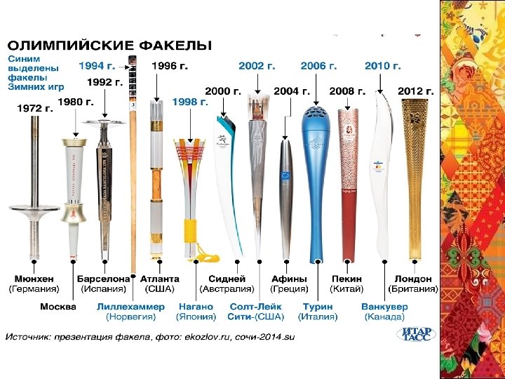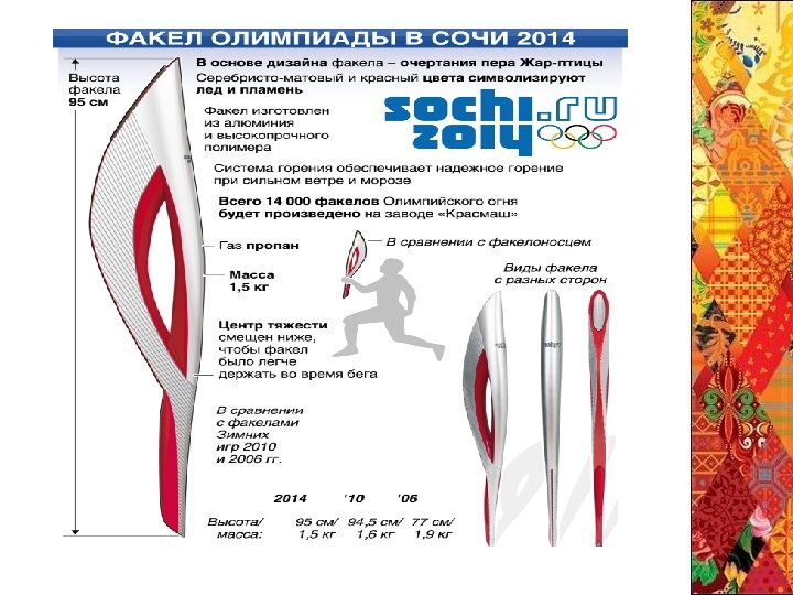 Корпус факела выполнен методом литья из алюминиевого сплава. Цвет — светло-серебристый «металлик» , фактура — мелкодисперсная матовая. В верхней части размещены эмблемы Олимпийских и Паралимпийских игр, выполненные способом инкрустации. Весит факел около 1, 8 кг, его высота — 0, 95 м, ширина — 160 мм, толщина — 54 мм. Вес и центр тяжести рассчитаны и подобраны для максимального удобства его использования во время бега. Россияне отметили, что «оригинальный дизайн факела» напоминает стилизованную букву «Р» . Факелоносцы В эстафете участвуют 14 тысяч факелоносцев. Им выдается удостоверение факелоносца и на память остаётся форма, в которой они несут факел.