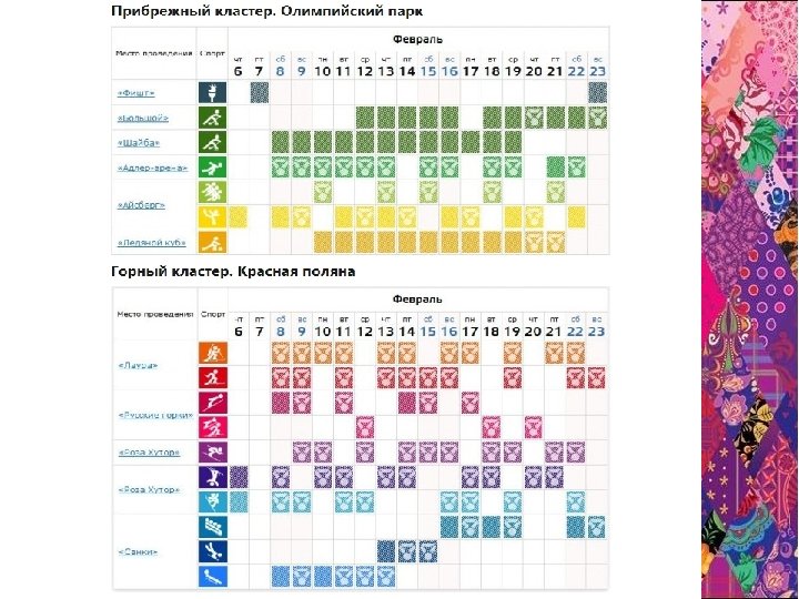 Соревнования пройдут в двух кластерах — горном и прибрежном. Церемония открытия и закрытия зимней Олимпиады в Сочи 2014 на стадионе Фишт. Соревнования по хоккею на льду среди мужских и женских команд пройдут на стадионах Большой и Шайба. Адлерарена пример участников и болельщиков скоростного бега на коньках. Здесь будут ежедневно разыгрываться медали на различных дистанциях конькобежного спорта. А вот соревнования по фигурному катанию начнутся уже 6 февраля и закончатся 22 февраля Галаконцертом на стадионе Айсберг. Здесь же пройдут и соревнования по шорт-треку. В горном кластере, комплекс для соревнований по лыжным гонкам и биатлону «Лаура» начнет отсчет медалям уже с 8 февраля, когда мы будем болеть на наши женские и мужские сборные по биатлону и лыжным гонкам. Полное расписание Олимпиады 2014 по дням, часам и месту проведения смотрите ниже в таблице.