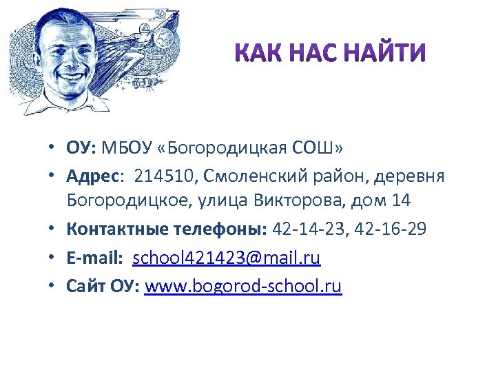 • ОУ: МБОУ «Богородицкая СОШ» • Адрес: 214510, Смоленский район, деревня Богородицкое, улица Викторова, дом 14 • Контактные телефоны: 42 -14 -23, 42 -16 -29 • E-mail: school 421423@mail. ru • Сайт ОУ: www. bogorod-school. ru