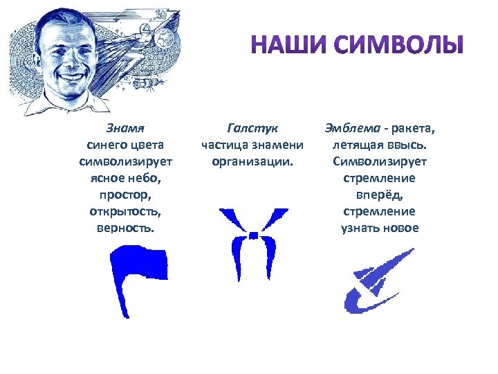 Знамя синего цвета символизирует ясное небо, простор, открытость, верность. Галстук частица знамени организации. Эмблема - ракета, летящая ввысь. Символизирует стремление вперёд, стремление узнать новое