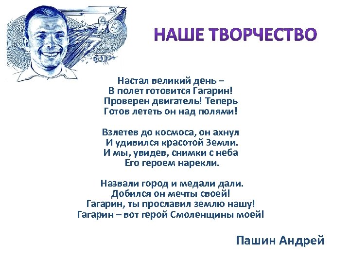 Настал великий день – В полет готовится Гагарин! Проверен двигатель! Теперь Готов лететь он над полями! Взлетев до космоса, он ахнул И удивился красотой Земли. И мы, увидев, снимки с неба Его героем нарекли. Назвали город и медали. Добился он мечты своей! Гагарин, ты прославил землю нашу! Гагарин – вот герой Смоленщины моей! Пашин Андрей