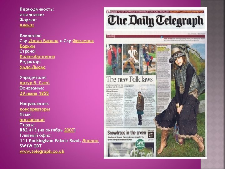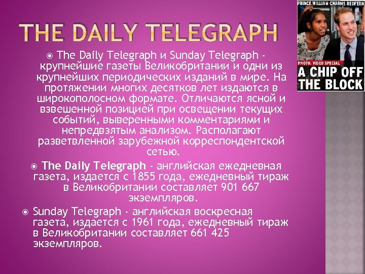 THE DAILY TELEGRAPH The Daily Telegraph и Sunday Telegraph крупнейшие газеты Великобритании и одни из крупнейших периодических изданий в мире. На протяжении многих десятков лет издаются в широкополосном формате. Отличаются ясной и взвешенной позицией при освещении текущих событий, выверенными комментариями и непредвзятым анализом. Располагают разветвленной зарубежной корреспондентской сетью. The Daily Telegraph - английская ежедневная газета, издается с 1855 года, ежедневный тираж в Великобритании составляет 901 667 экземпляров. Sunday Telegraph - английская воскресная газета, издается с 1961 года, ежедневный тираж в Великобритании составляет 661 425 экземпляров.