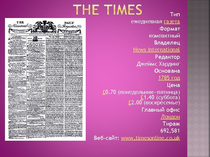 Tип ежедневная газета Формат компактный Владелец News International Редактор Джеймс Хардинг Основана 1785 год Цена £ 0. 70 (понедельник—пятница) £ 1. 40 (суббота) £ 2. 00 (воскресенье) Главный офис Лондон Тираж 692, 581 Веб-сайт: www. timesonline. co. uk