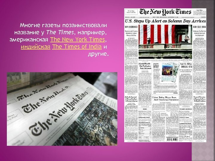 Многие газеты позаимствовали название у The Times, например, американская The New York Times, индийская The Times of India и другие.