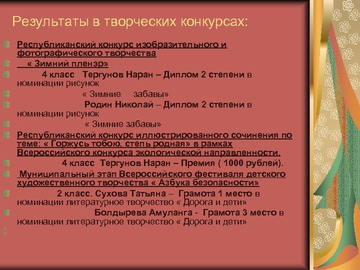 Результаты в творческих конкурсах: Республиканский конкурс изобразительного и фотографического творчества « Зимний пленэр» 4 класс Тергунов Наран – Диплом 2 степени в номинации рисунок « Зимние забавы» Родин Николай – Диплом 2 степени в номинации рисунок « Зимние забавы» Республиканский конкурс иллюстрированного сочинения по теме: « Горжусь тобою, степь родная» в рамках Всероссийского конкурса экологической направленности. 4 класс Тергунов Наран – Премия ( 1000 рублей). Муниципальный этап Всероссийского фестиваля детского художественного творчества « Азбука безопасности» 2 класс. Сухова Татьяна – Грамота 1 место в номинации литературное творчество « Дорога и дети» Болдырева Амуланга - Грамота 3 место в номинации литературное творчество « Дорога и дети»