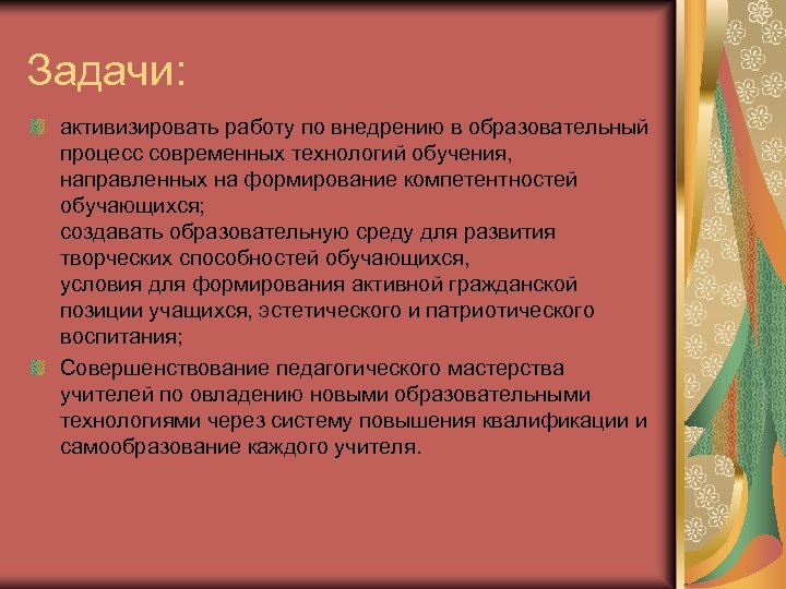 Задачи: активизировать работу по внедрению в образовательный процесс современных технологий обучения, направленных на формирование компетентностей обучающихся; создавать образовательную среду для развития творческих способностей обучающихся, условия для формирования активной гражданской позиции учащихся, эстетического и патриотического воспитания; Совершенствование педагогического мастерства учителей по овладению новыми образовательными технологиями через систему повышения квалификации и самообразование каждого учителя.