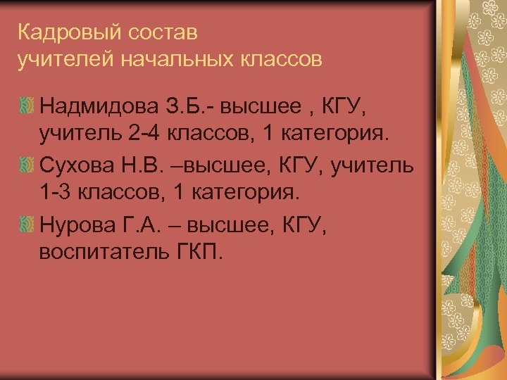 Кадровый состав учителей начальных классов Надмидова З. Б. - высшее , КГУ, учитель 2 -4 классов, 1 категория. Сухова Н. В. –высшее, КГУ, учитель 1 -3 классов, 1 категория. Нурова Г. А. – высшее, КГУ, воспитатель ГКП.