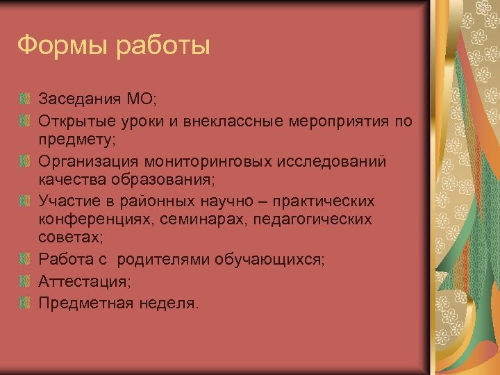 Формы работы Заседания МО; Открытые уроки и внеклассные мероприятия по предмету; Организация мониторинговых исследований качества образования; Участие в районных научно – практических конференциях, семинарах, педагогических советах; Работа с родителями обучающихся; Аттестация; Предметная неделя.