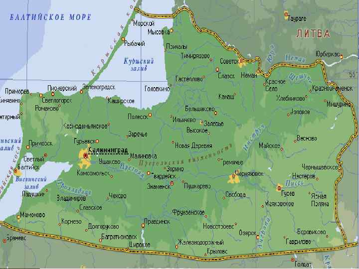 ЭГП области Калининградская область, находящаяся на юге Балтийского моря, отделена от основной территории России - Литвой и Польшей (анклав). Основные города Калининградской области: Калининград Черняховск Гусев Светлый Балтийск Светлогорск Советск