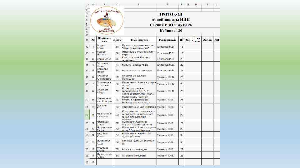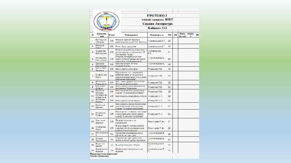 Организация школьной научно-практической конференции «Горизонты открытий» Организатор, куратор проектной деятельности: Чурбанова Ольга Александровна 1. Разработка положения научно-практической конференции (содержание, порядок оформления, порядок и сроки проведения предварительного допуска к защите, очной защиты проекта, порядок и систему оценивания ИИП при предварительном допуске к защите, при очной защите). 2. Создает комиссию для проведения предварительного допуска к защите ИИП и курирует ее деятельность. 3. Создает комиссию для проведения очной защиты ИИП. 4. Разрабатывает оценочные листы для проведения предварительного допуска к защите, для очной защиты. 5. Собирает и систематизирует информацию о темах проектов среди учащихся 5 - 8 классов. 5. Приглашает преподавателей ЧГУ для работы в комиссиях при очной защите ИИП в качестве председателей. 6. Готовит сценарий торжественного открытия конференции, проводит репетицию. 7. Собирает и систематизирует информацию о лучших проектах. 8. Организовывает торжественное вручение дипломов в номинации "Лучший проект"