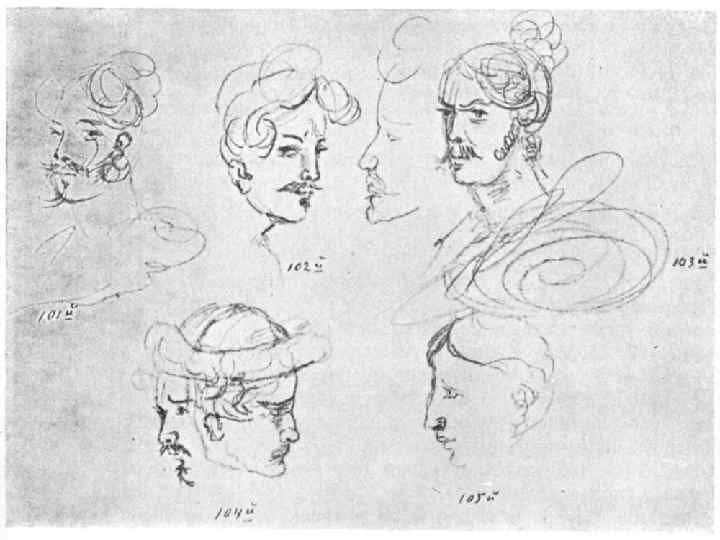 Набросок лошадей, скачущего всадника, мужской головы Перо. 1840.