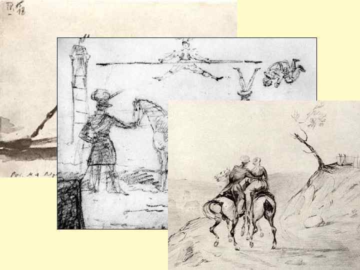 Огромным интересом служат многочисленные рисунки поэта из так называемой «Юнкерской тетради» , созданные во время пребывания Лермонтова в юнкерской школе в 1832 -1834 годах. В основном, это портретные зарисовки и жанровые сценки, выполненные с натуры. Многие из таких рисунков некоторые исследователи считают карикатурами.