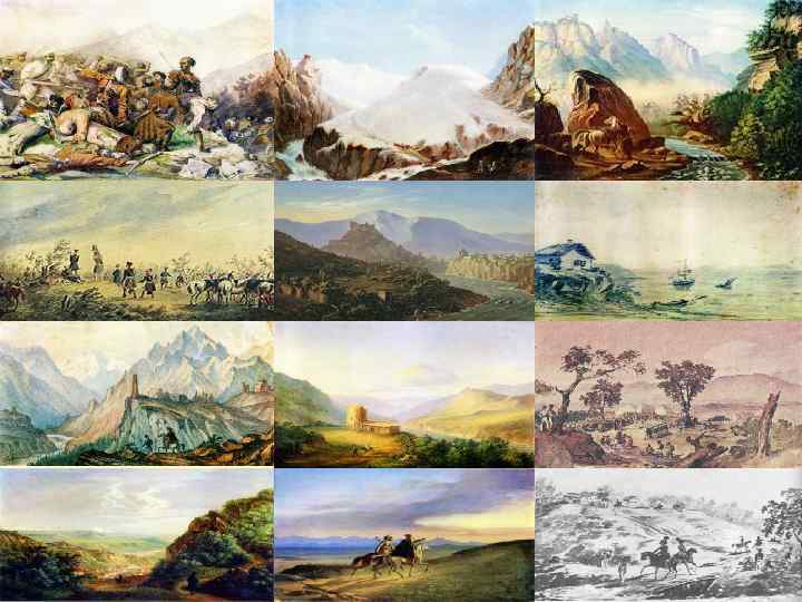 Лермонтову - писателю всегда помогал Лермонтов-художник. Наиболее интересны пейзажи, выполненные маслом: «Вид Пятигорска» «Военно-Грузинская дорога близ Мцхета» «Вид Тифлиса» «Окрестности селения Карагач» и другие (все 1837 - 1838). Любая кавказская панорама Лермонтова - это как бы малый фрагмент целой Вселенной. .