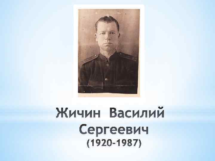 Жичин Василий Сергеевич, мой прадед, до войны был директором средней школы Воскресенского района. На фронт забрали его в августе 1941 года. Его направили на курсы артиллериста. После окончания курсов с Красной площади был отправлен на фронт. Он командовал артиллерией. Очень большое сражение было под городом Ржевском. За боевые сражения. Он имел много наград. Войну закончил в Австрии в городе Вена.