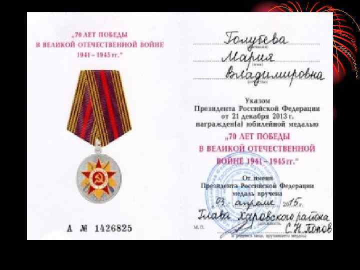 Голубева Мария Владимировна Награждена Орденом Трудового Красного Знамени, медалью «Юбилейная Ленинградская» , знаком «Отличник народного просвещения» , юбилейными медалями « 60 лет Победы» , « 65 лет Победы» , грамотами РОНО и ОБЛОНО, имеет значок «Учитель методист» , звание «Ветеран труда» , «Ветеран войны» .