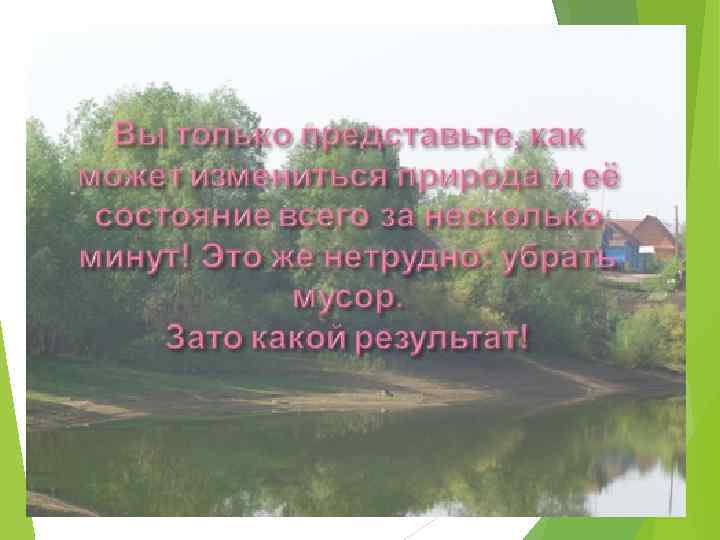 Раздел 2. Мои цели Поселок в котором я живу, большой и очень красивый. Однако весной, как только начинает таять снег, обнажается другая сторона поселка, кругом разбросан мусор. Постоянно захламляются берега пруда. Таким образом вода в водоёме загрязняется, он становится непригодным для купания. Моя цель: привлечение внимание детей и взрослых к проблеме загрязнения села и пруда, формирование экологической культуры и твёрдого убеждения в том, что мусору место на свалке, а не на улицах.