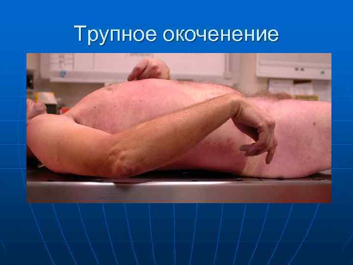Признаки биологической смерти n n Охлаждение тела (температура тела падает на 1 градус в час при температуре воздуха 1618 градусов С. Трупные пятна - на той стороне тела, на которой лежит труп. Трупное окоченение, начинается с мышц лица и шеи и постепенно переходит на туловище и нижние конечности - завершается через 24 ч, затем начинается размягчение. «Кошачий глаз» (через 30 -40 мин после остановки сердца) - если сдавить глазное яблоко с боков - зрачок превращается в узкую вертикальную щель и остается в таком состоянии.