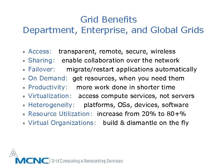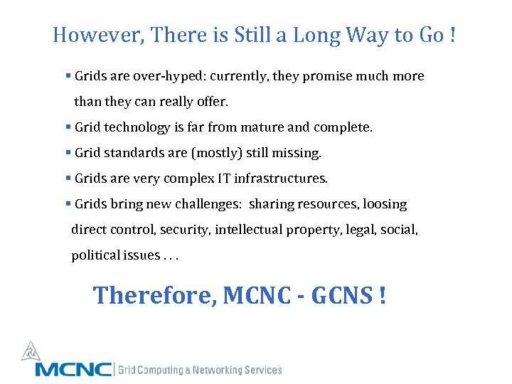 However, There is Still a Long Way to Go ! § Grids are over-hyped: currently, they promise much more than they can really offer. § Grid technology is far from mature and complete. § Grid standards are (mostly) still missing. § Grids are very complex IT infrastructures. § Grids bring new challenges: sharing resources, loosing direct control, security, intellectual property, legal, social, political issues. . . Therefore, MCNC - GCNS !