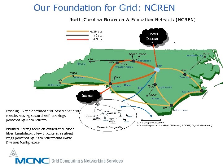 Our Foundation for Grid: NCREN Internet 4 -7 MCNC-owned Clusters 2 distributed throughout the state NLR Locations still under evaluation Cisco Internet Existing: Blend of owned and leased fiber and circuits moving toward resilient rings powered by Cisco routers Planned: Strong focus on owned and leased fiber, Lambda, and few circuits, in resilient rings powered by Cisco routers and Wave Division Multiplexers EPA
