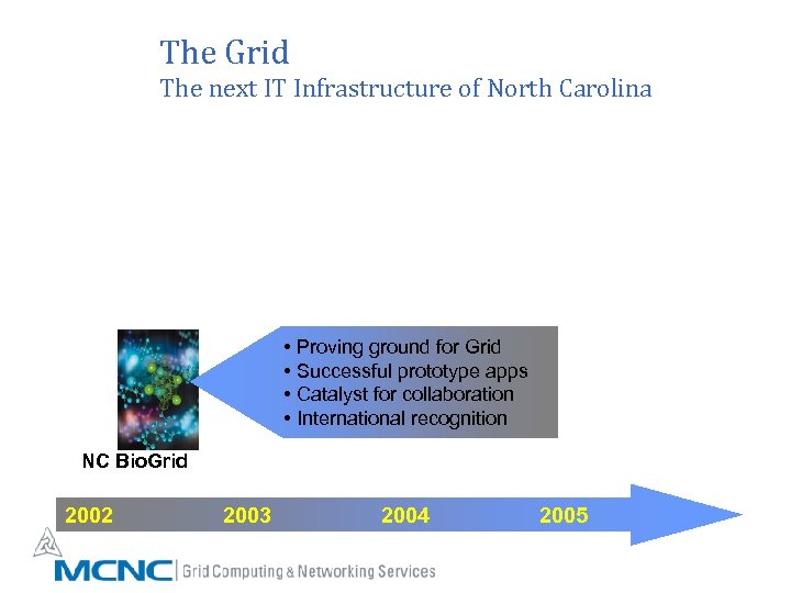 The Grid The next IT Infrastructure of North Carolina • Proving ground for Grid • Successful prototype apps • Catalyst for collaboration • International recognition NC Bio. Grid 2002 2003 2004 2005