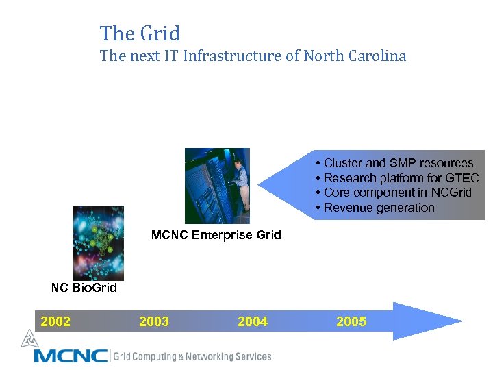 The Grid The next IT Infrastructure of North Carolina • Cluster and SMP resources • Research platform for GTEC • Core component in NCGrid • Revenue generation MCNC Enterprise Grid NC Bio. Grid 2002 2003 2004 2005