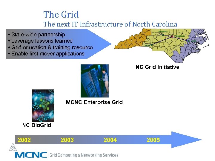 The Grid The next IT Infrastructure of North Carolina • State-wide partnership • Leverage lessons learned • Grid education & training resource • Enable first mover applications NC Grid Initiative MCNC Enterprise Grid NC Bio. Grid 2002 2003 2004 2005