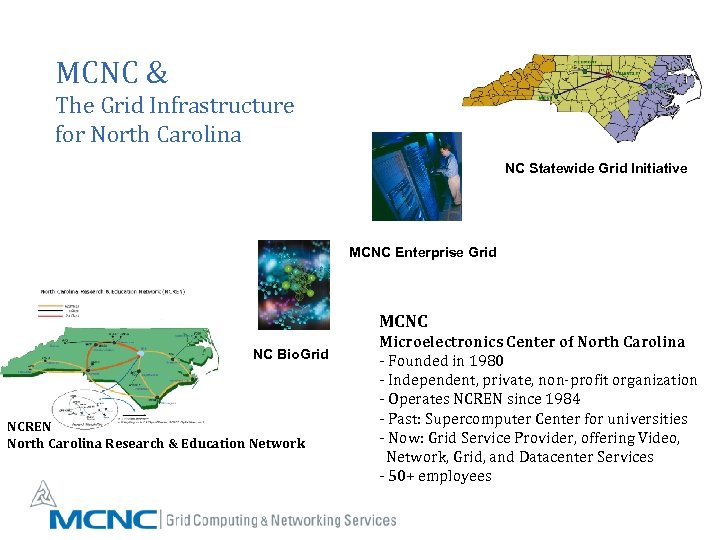 MCNC & The Grid Infrastructure for North Carolina NC Statewide Grid Initiative MCNC Enterprise Grid MCNC NC Bio. Grid NCREN North Carolina Research & Education Network Microelectronics Center of North Carolina - Founded in 1980 - Independent, private, non-profit organization - Operates NCREN since 1984 - Past: Supercomputer Center for universities - Now: Grid Service Provider, offering Video, Network, Grid, and Datacenter Services - 50+ employees