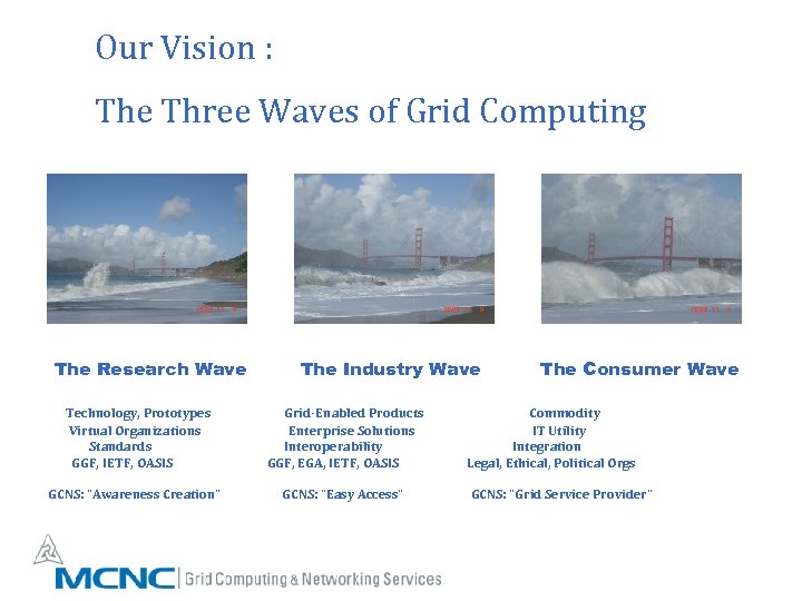 Our Vision : The Three Waves of Grid Computing The Research Wave Technology, Prototypes Virtual Organizations Standards GGF, IETF, OASIS GCNS: “Awareness Creation” The Industry Wave Grid-Enabled Products Enterprise Solutions Interoperability GGF, EGA, IETF, OASIS GCNS: “Easy Access” The Consumer Wave Commodity IT Utility Integration Legal, Ethical, Political Orgs GCNS: “Grid Service Provider”