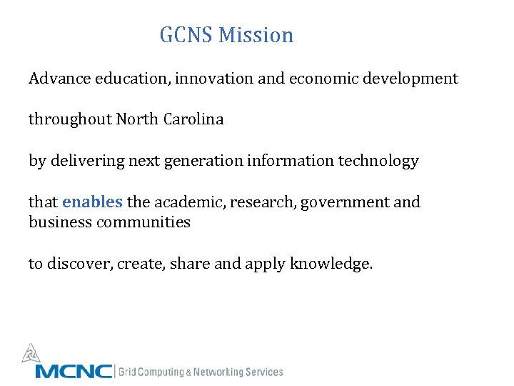 GCNS Mission Advance education, innovation and economic development throughout North Carolina by delivering next generation information technology that enables the academic, research, government and business communities to discover, create, share and apply knowledge.