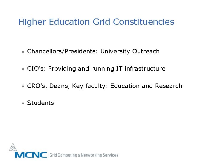 Higher Education Grid Constituencies • Chancellors/Presidents: University Outreach • CIO’s: Providing and running IT infrastructure • CRO’s, Deans, Key faculty: Education and Research • Students