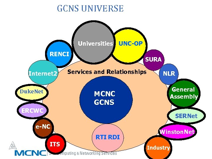 GCNS UNIVERSE Universities UNC-OP RENCI Internet 2 Duke. Net SURA Services and Relationships NLR General Assembly MCNC GCNS ERCWC SERNet e-NC ITS RTI RDI Winston. Net Industry
