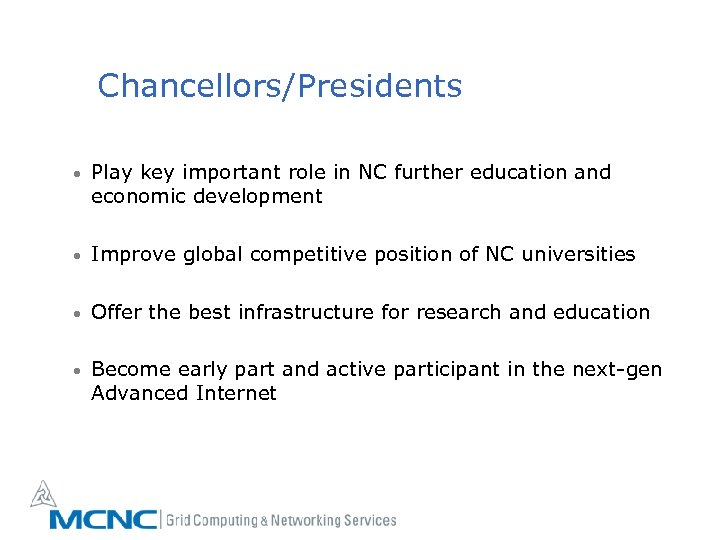 Chancellors/Presidents • Play key important role in NC further education and economic development • Improve global competitive position of NC universities • Offer the best infrastructure for research and education • Become early part and active participant in the next-gen Advanced Internet