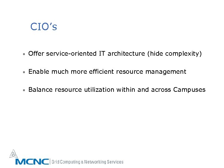 CIO’s • Offer service-oriented IT architecture (hide complexity) • Enable much more efficient resource management • Balance resource utilization within and across Campuses