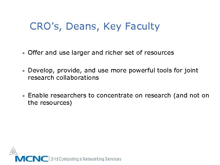 CRO’s, Deans, Key Faculty • Offer and use larger and richer set of resources • Develop, provide, and use more powerful tools for joint research collaborations • Enable researchers to concentrate on research (and not on the resources)