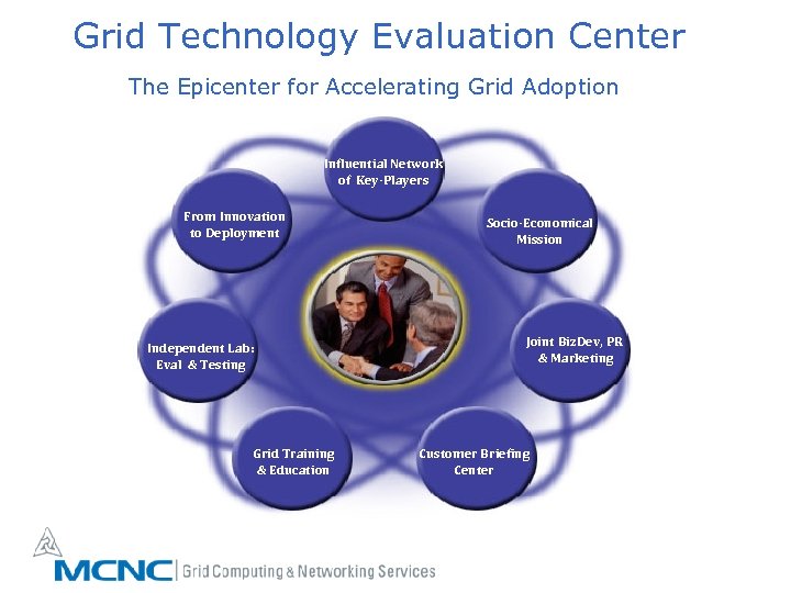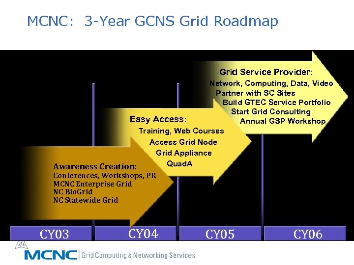 MCNC: 3 -Year GCNS Grid Roadmap Grid Service Provider: Network, Computing, Data, Video Partner with SC Sites Build GTEC Service Portfolio Start Grid Consulting Easy Access: Annual GSP Workshop Training, Web Courses Access Grid Node Grid Appliance Quad. A Awareness Creation: Conferences, Workshops, PR MCNC Enterprise Grid NC Bio. Grid NC Statewide Grid CY 03 CY 04 CY 05 CY 06